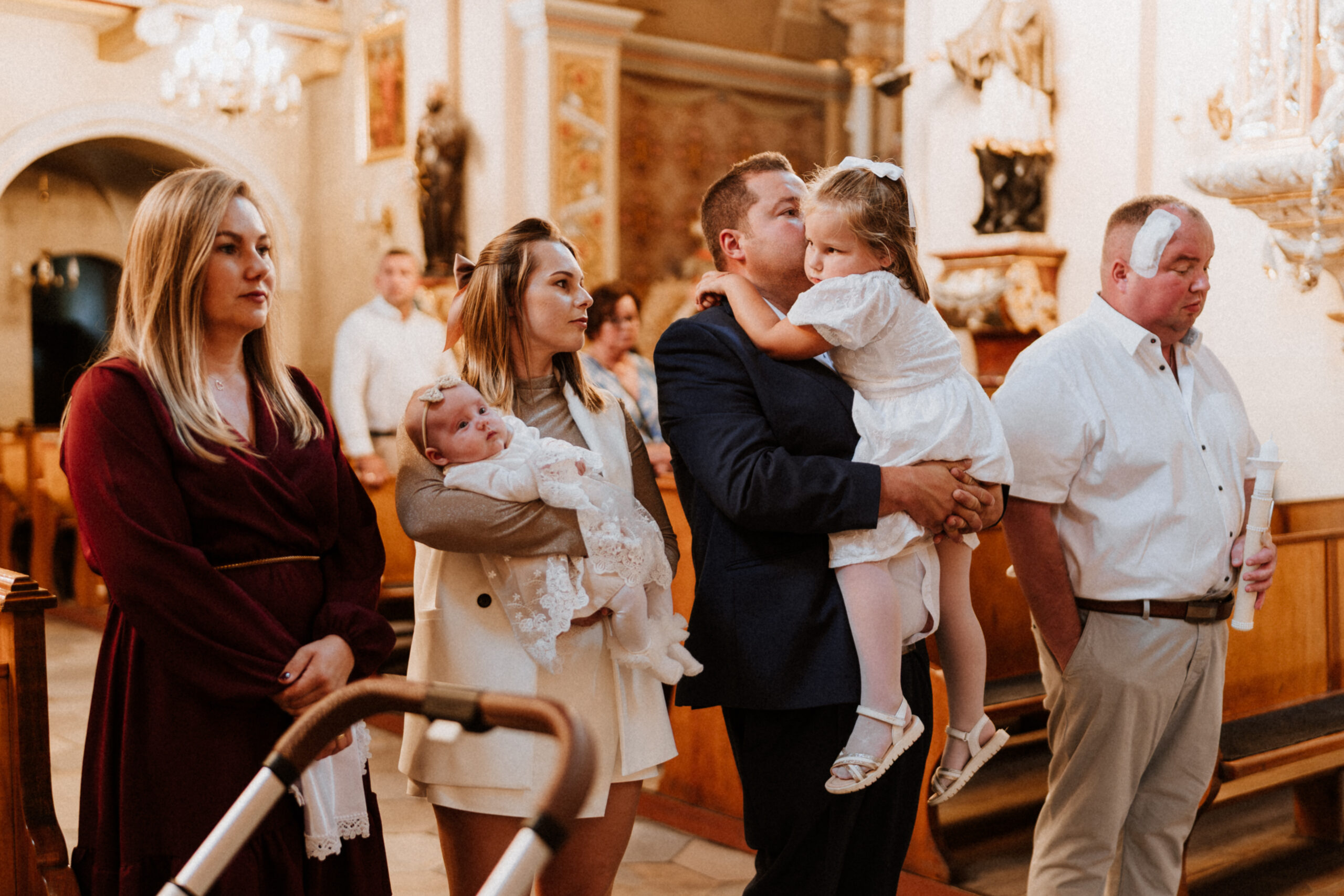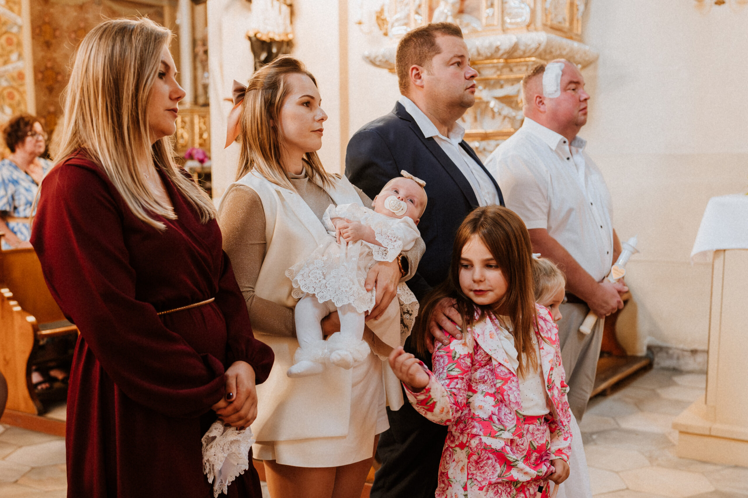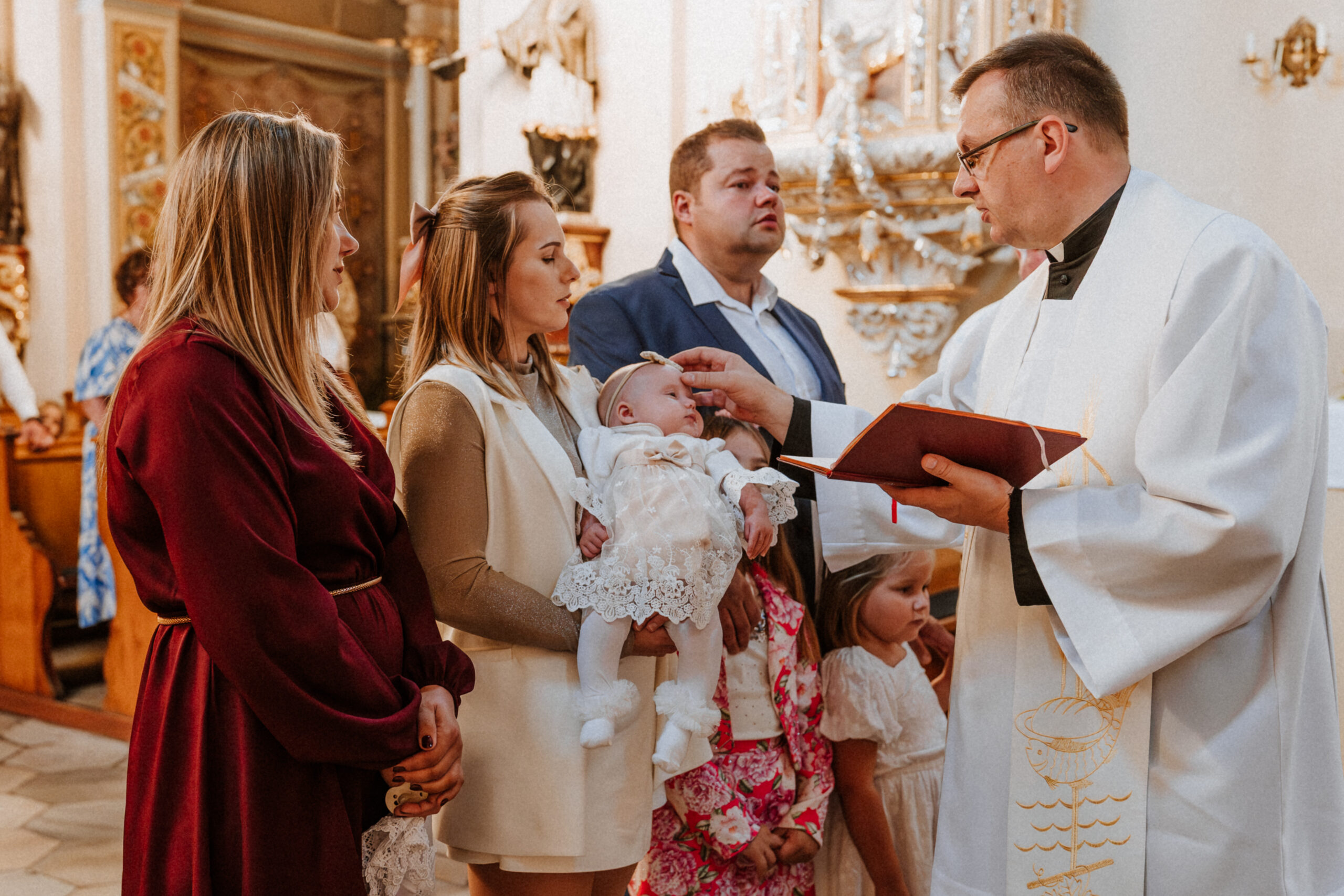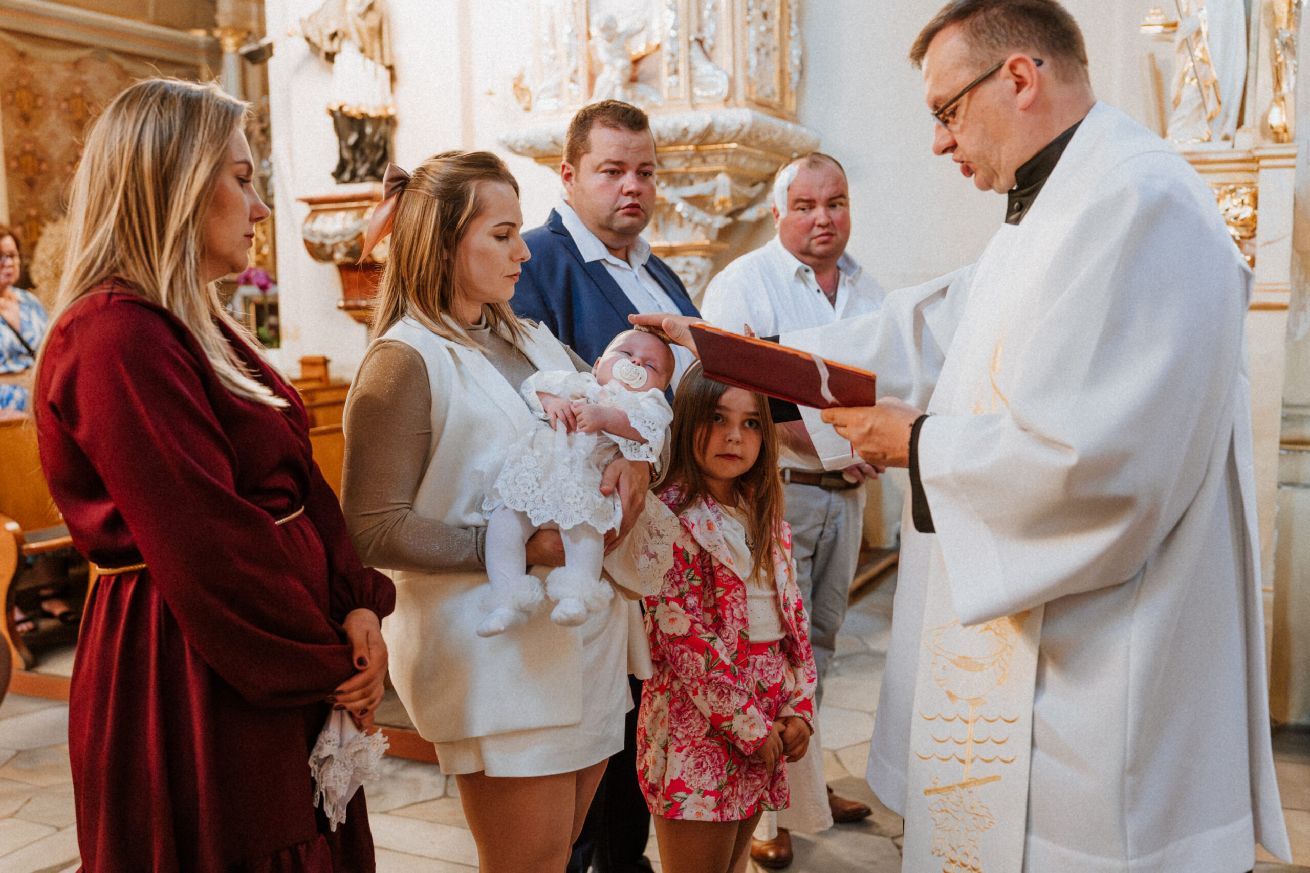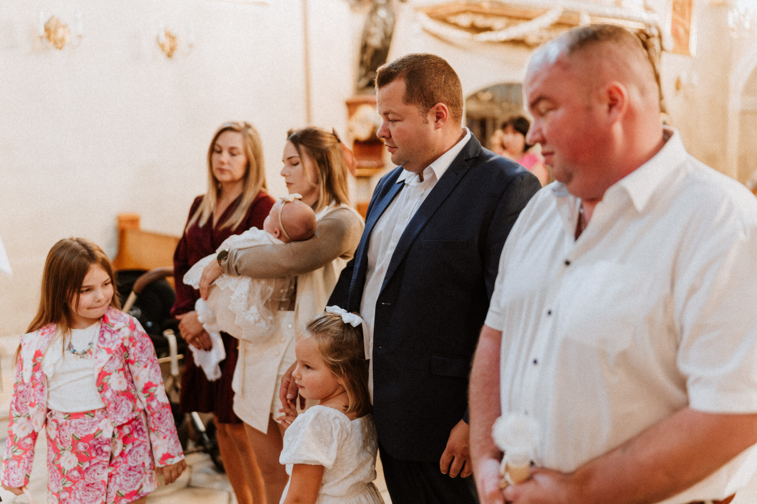 Potem przychodzi moment w kościele. Ciche szepty, zapach świec, dźwięk wody święconej. W oczach rodziców – wzruszenie. W dłoniach chrzestnych – duma i troska. A ja stoję obok, nie zakłócając tej chwili, tylko zatrzymując ją taką, jaka jest: pełną miłości, spokoju i symbolicznego początku.