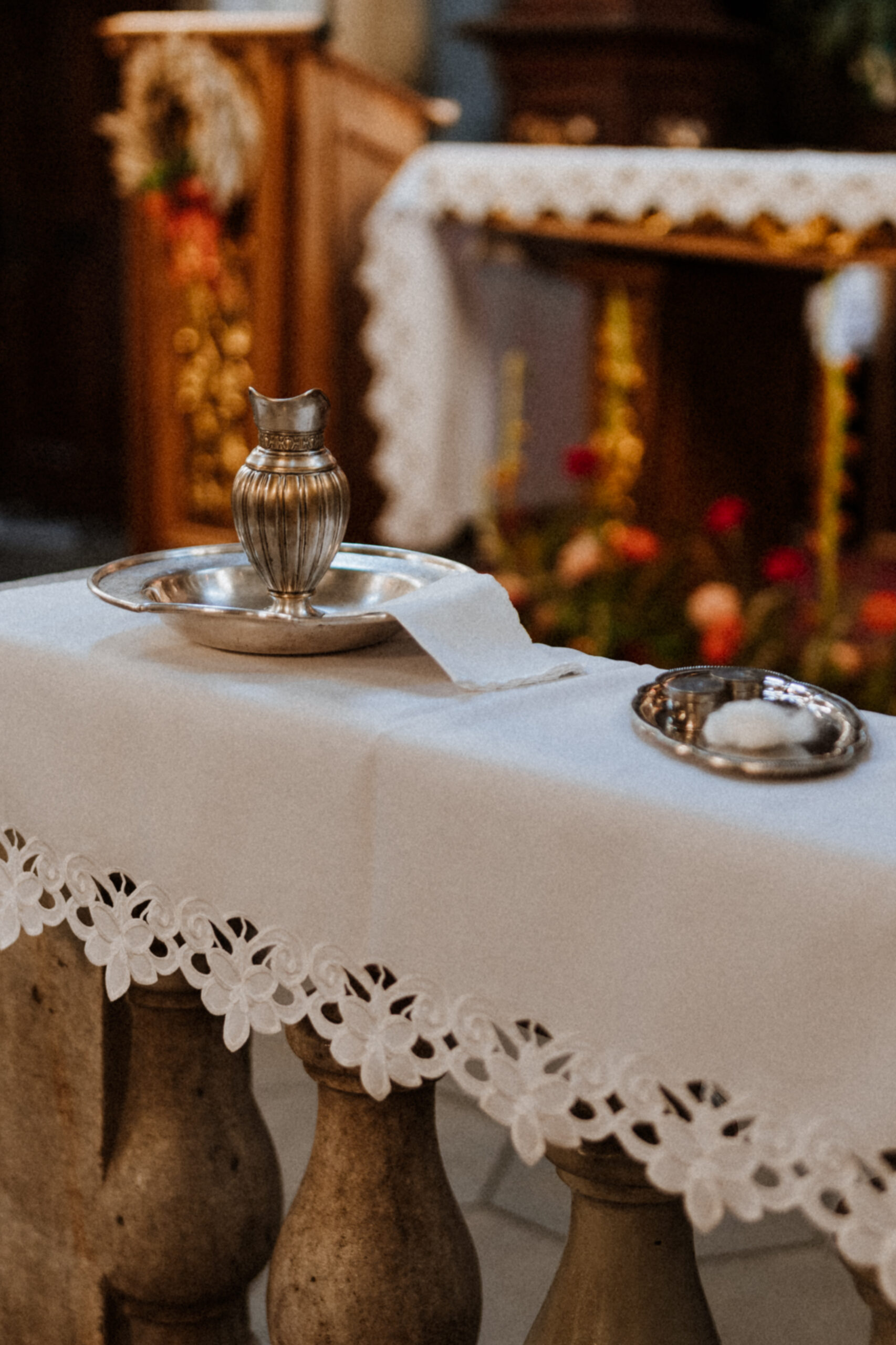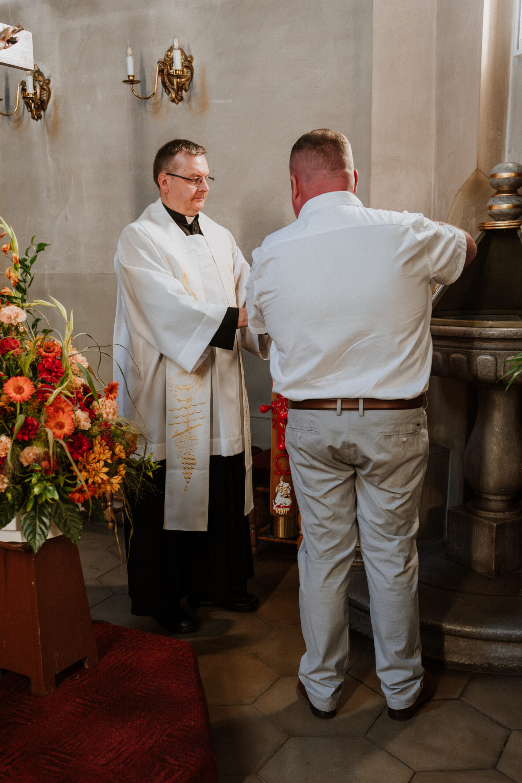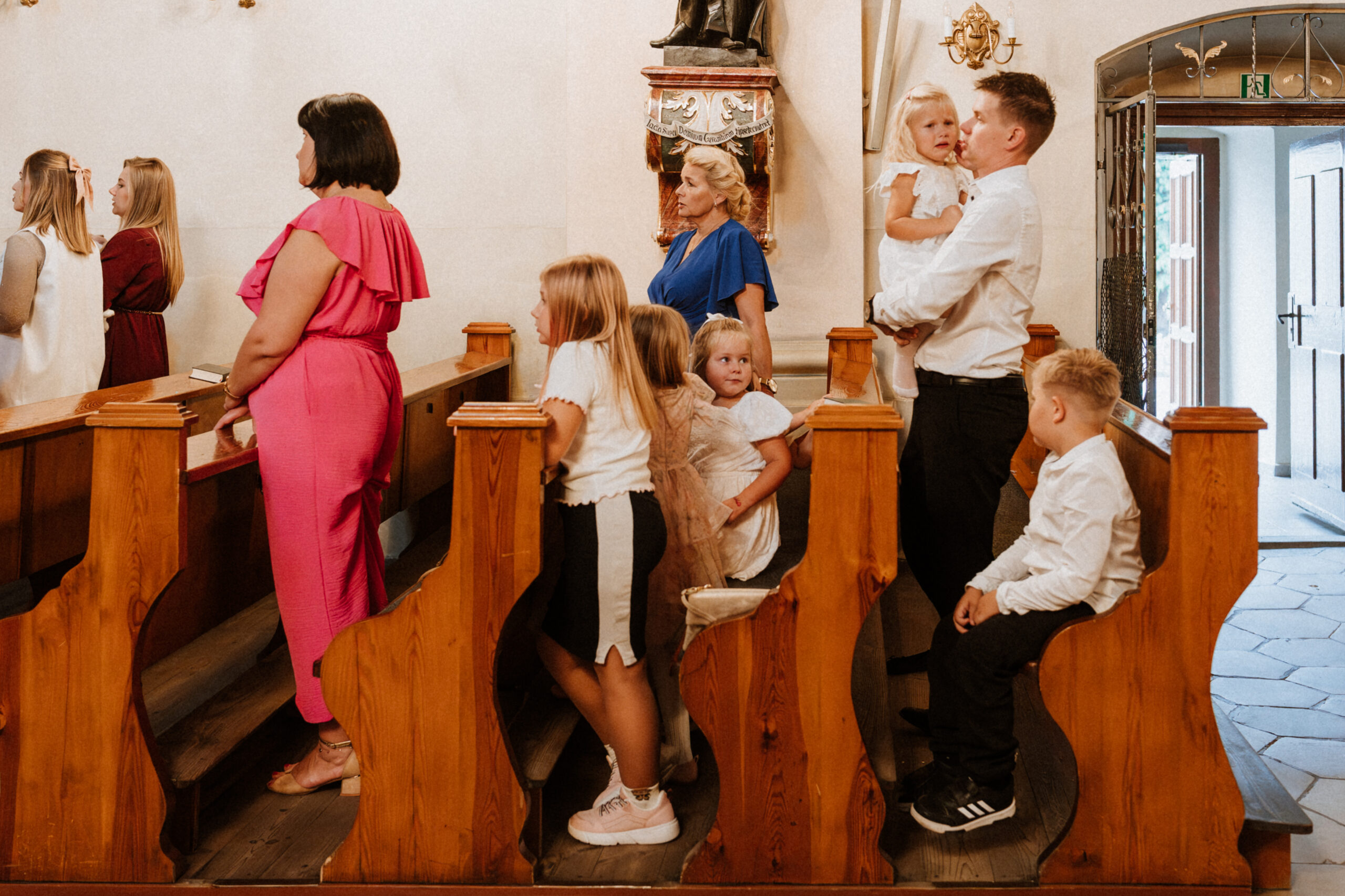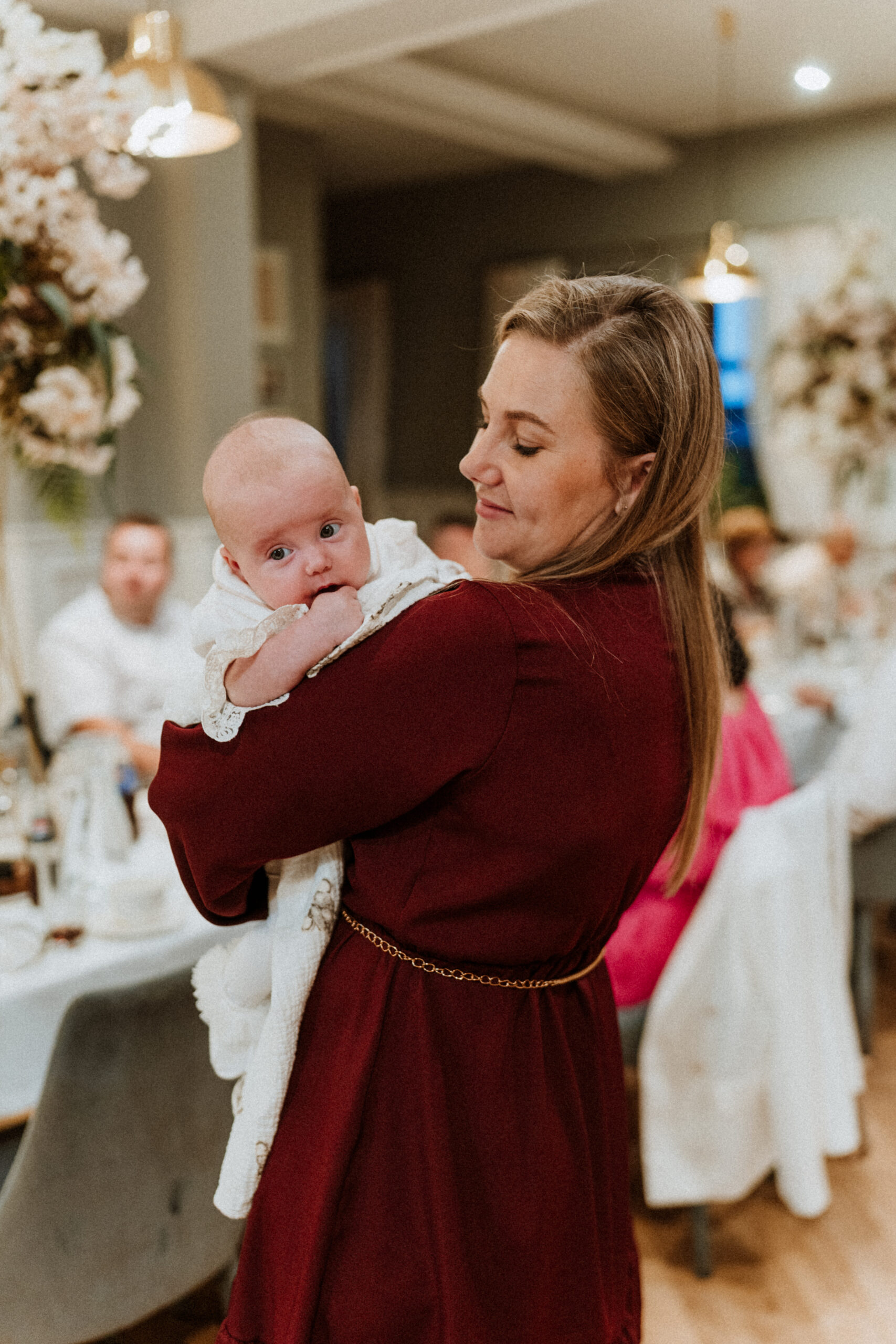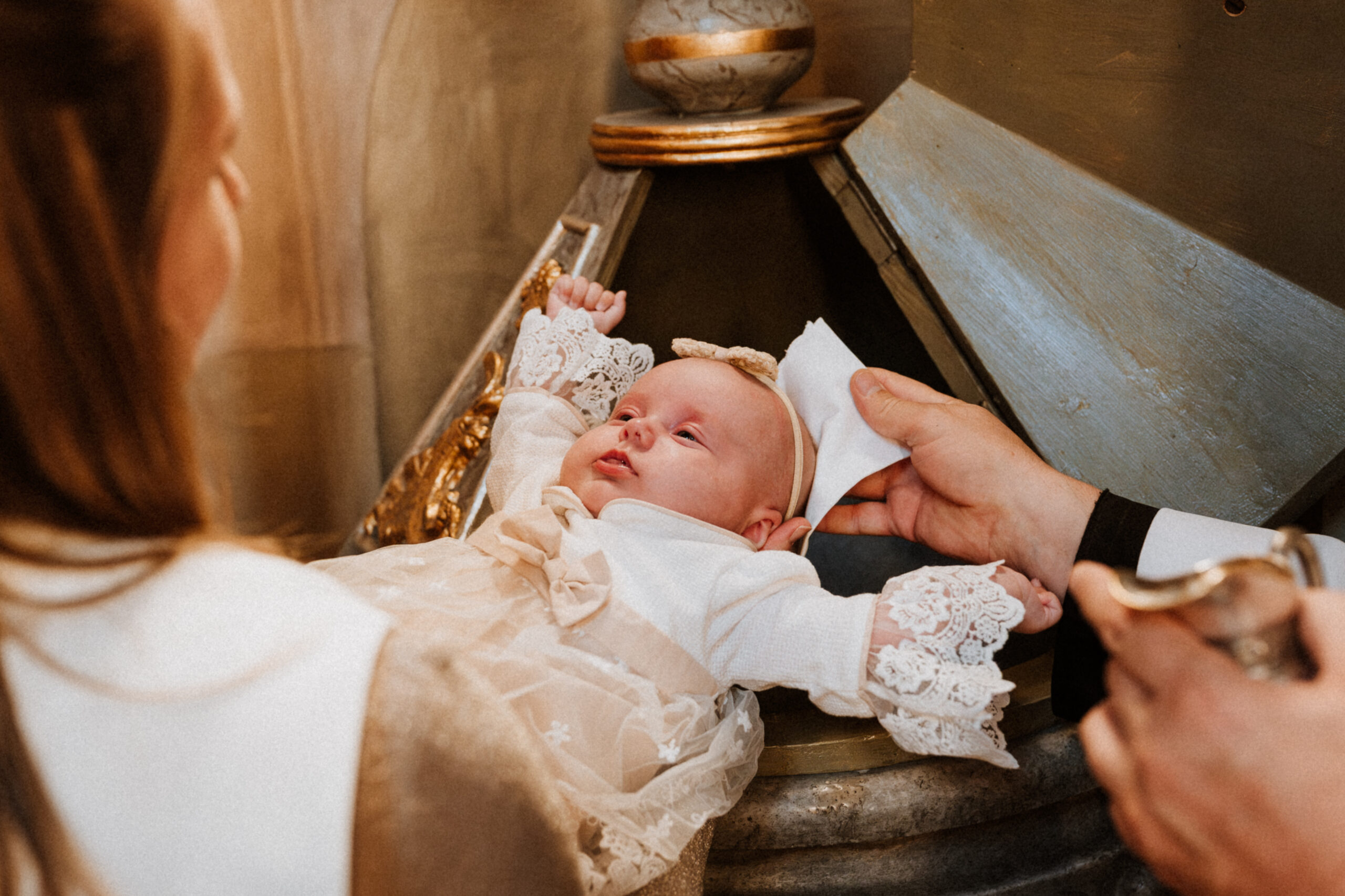 Potem przychodzi moment w kościele. Ciche szepty, zapach świec, dźwięk wody święconej. W oczach rodziców – wzruszenie. W dłoniach chrzestnych – duma i troska. A ja stoję obok, nie zakłócając tej chwili, tylko zatrzymując ją taką, jaka jest: pełną miłości, spokoju i symbolicznego początku.