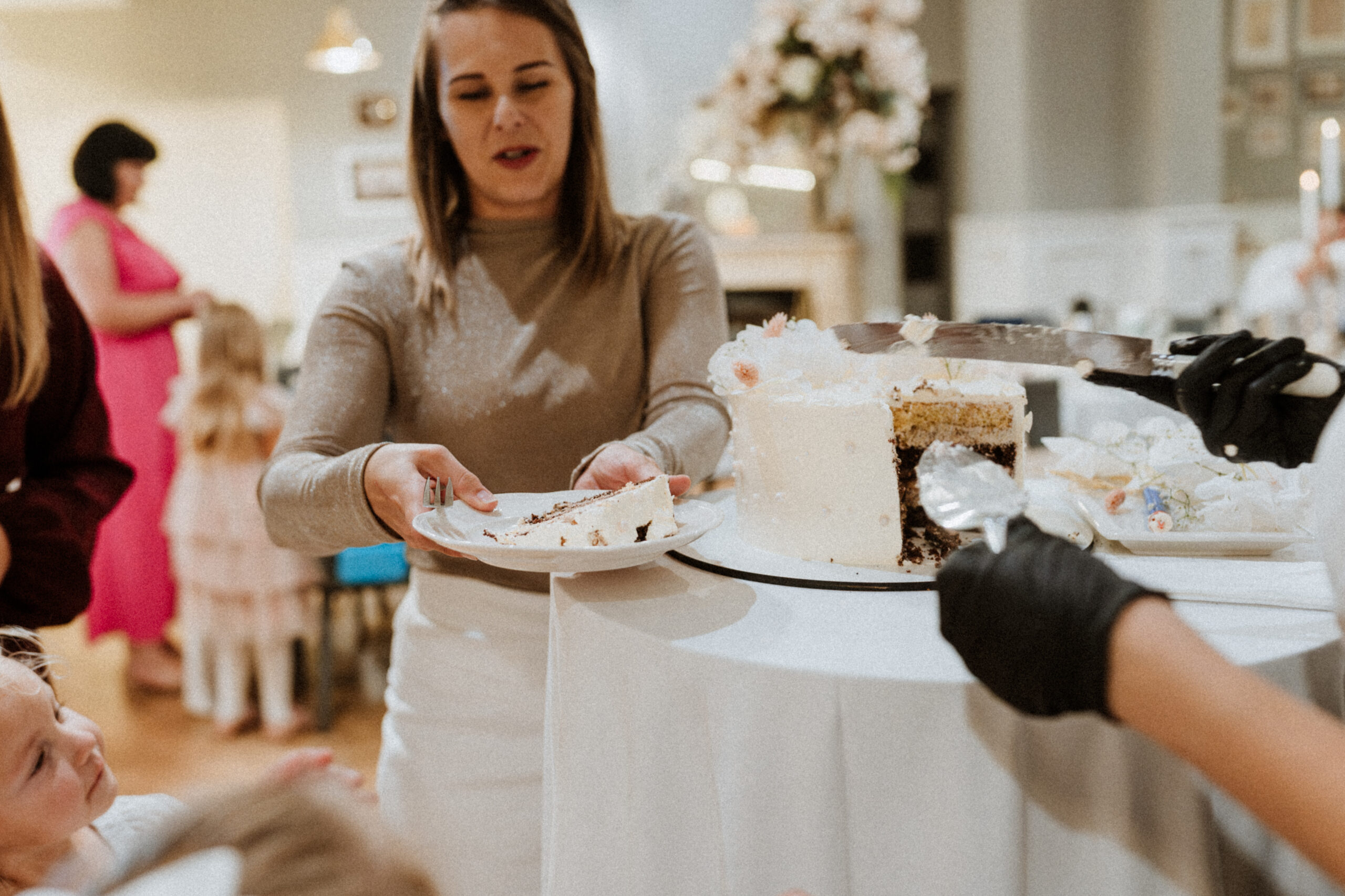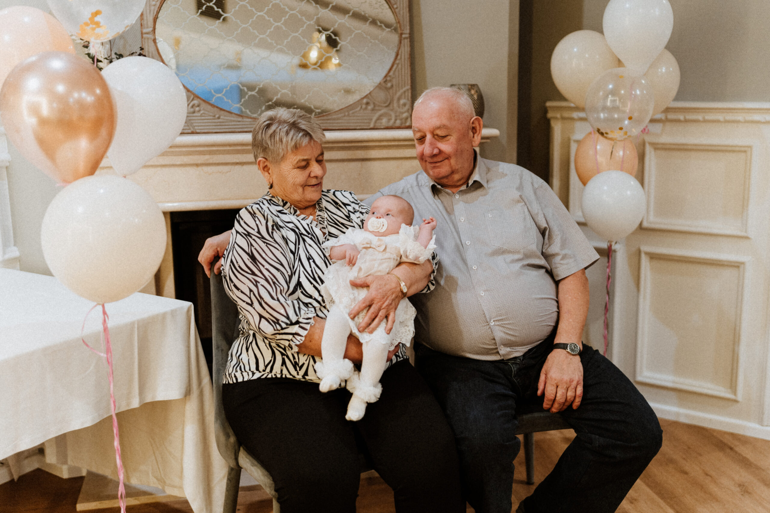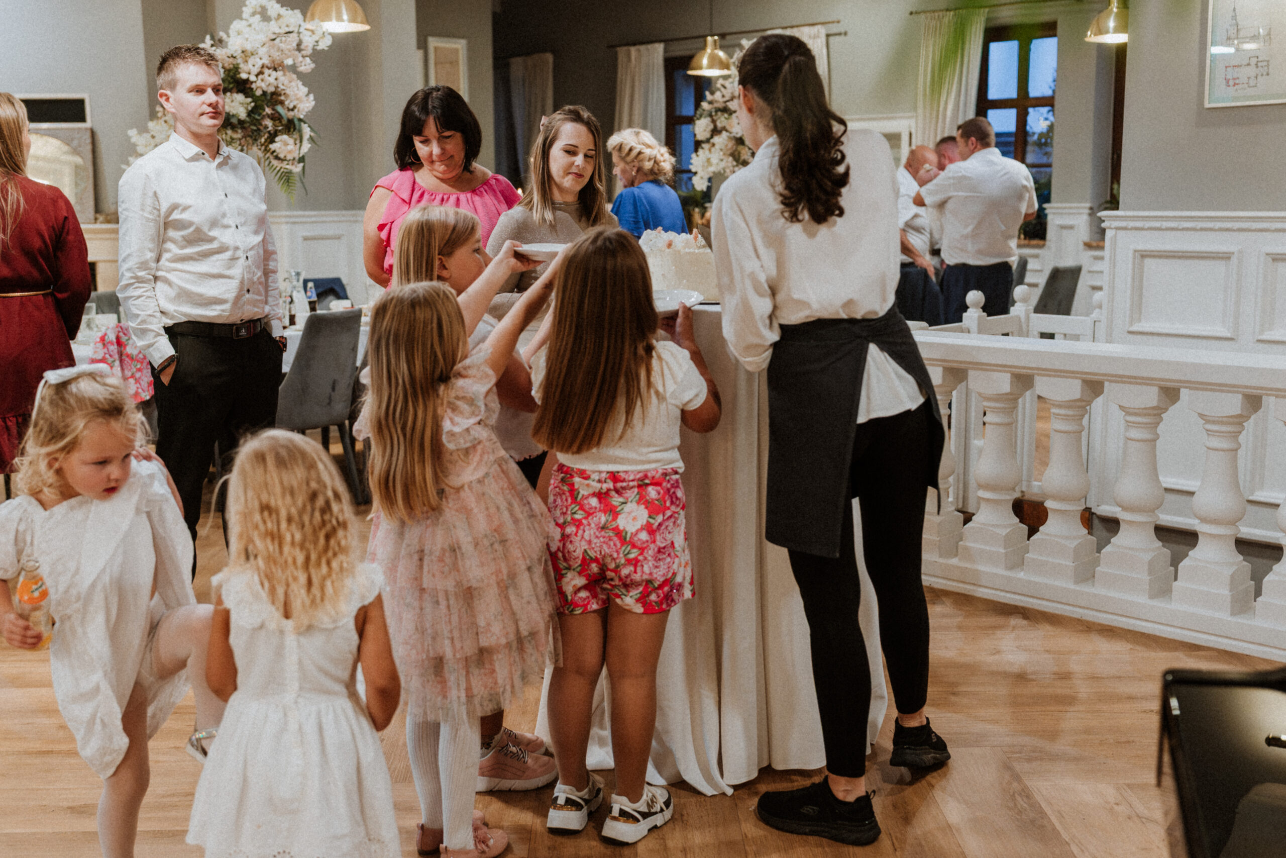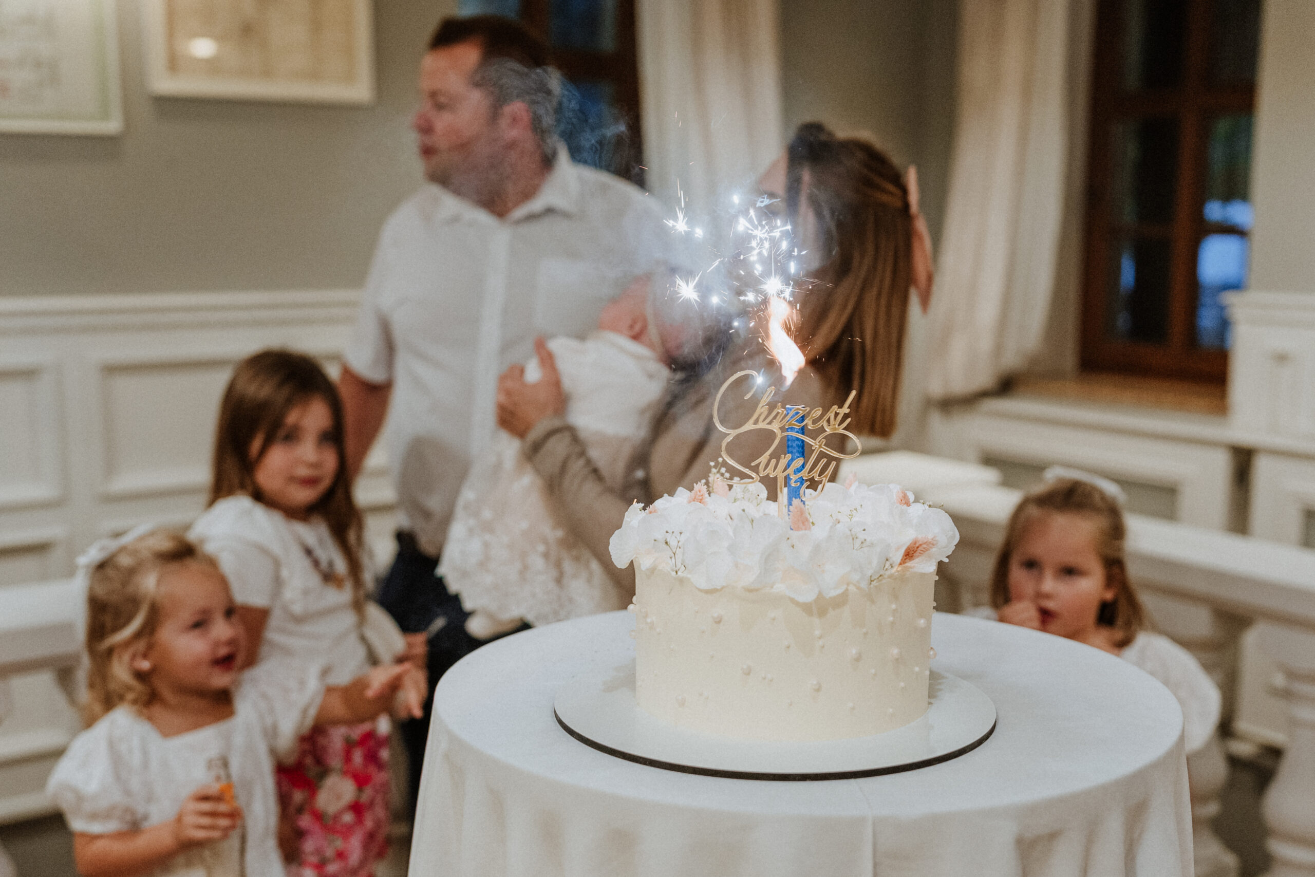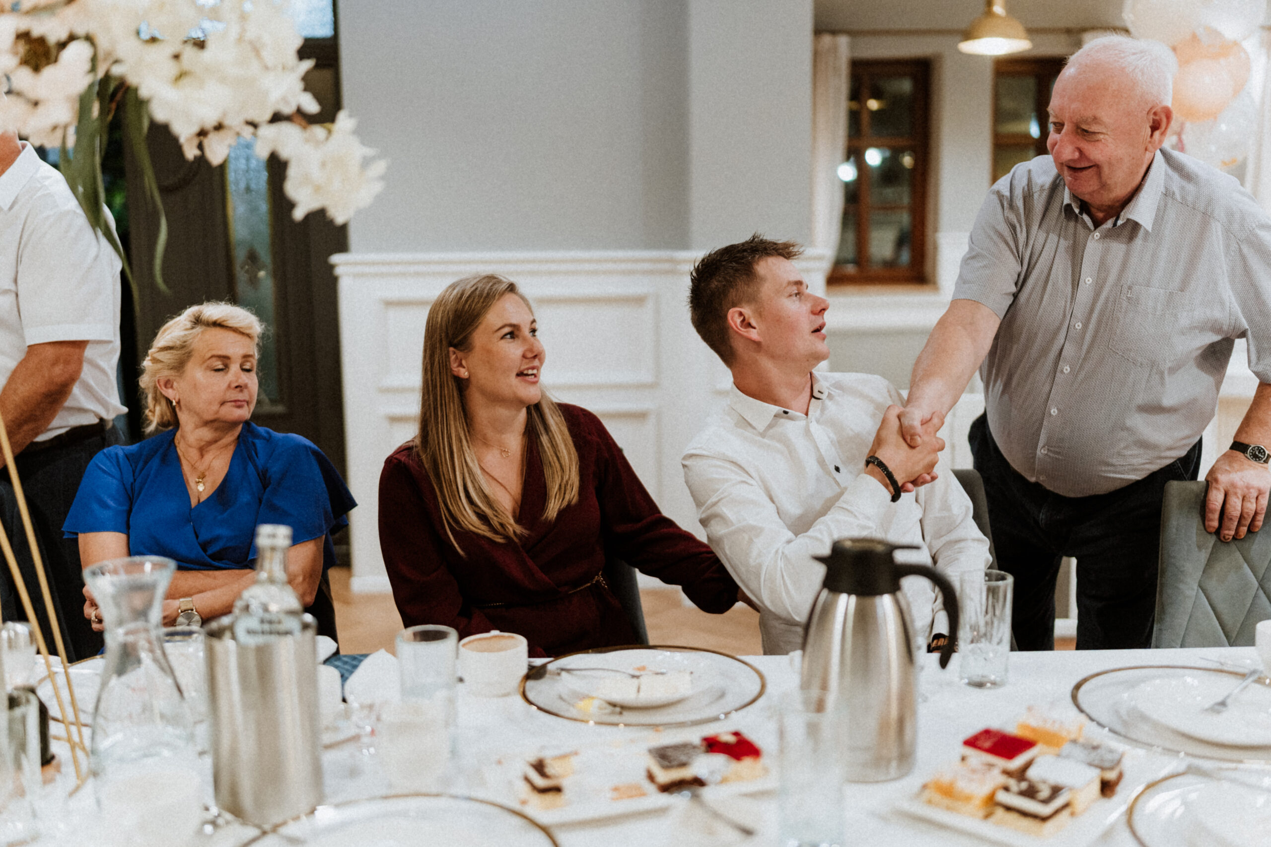 Po uroczystości – już mniej oficjalnie. Śmiech przy stole, dzieci biegające wokół, ciasta, które znikają szybciej niż można zrobić zdjęcie, babcia tuląca wnuczka i dziadek, który po raz kolejny powtarza, że „to szczęście mieć taką rodzinę”.