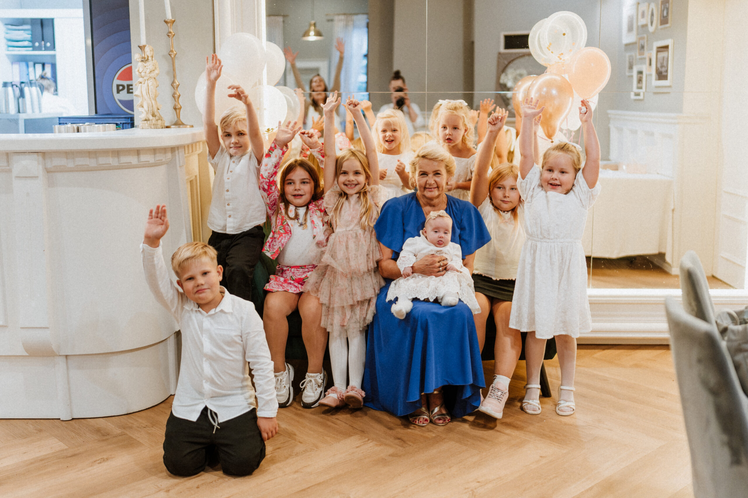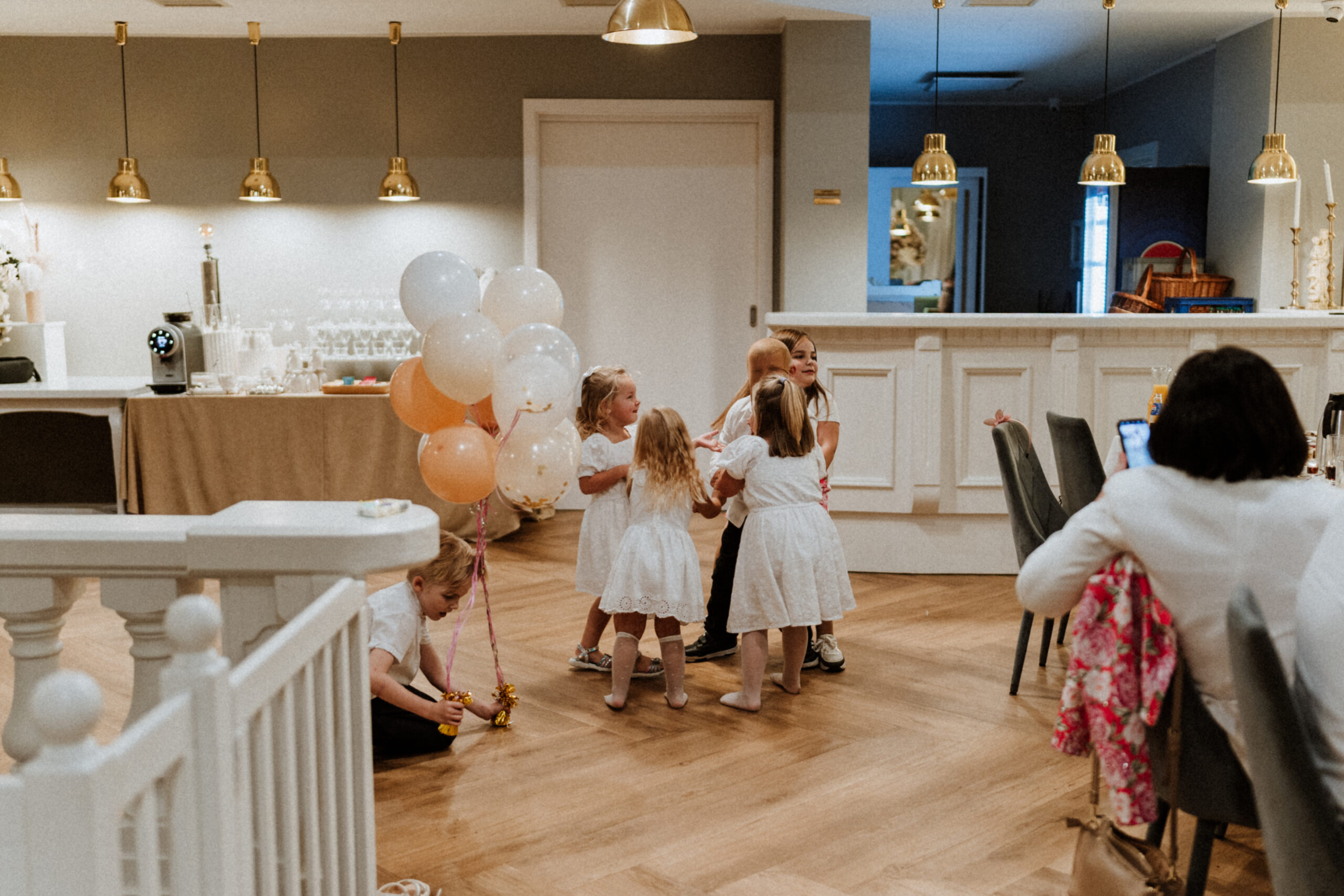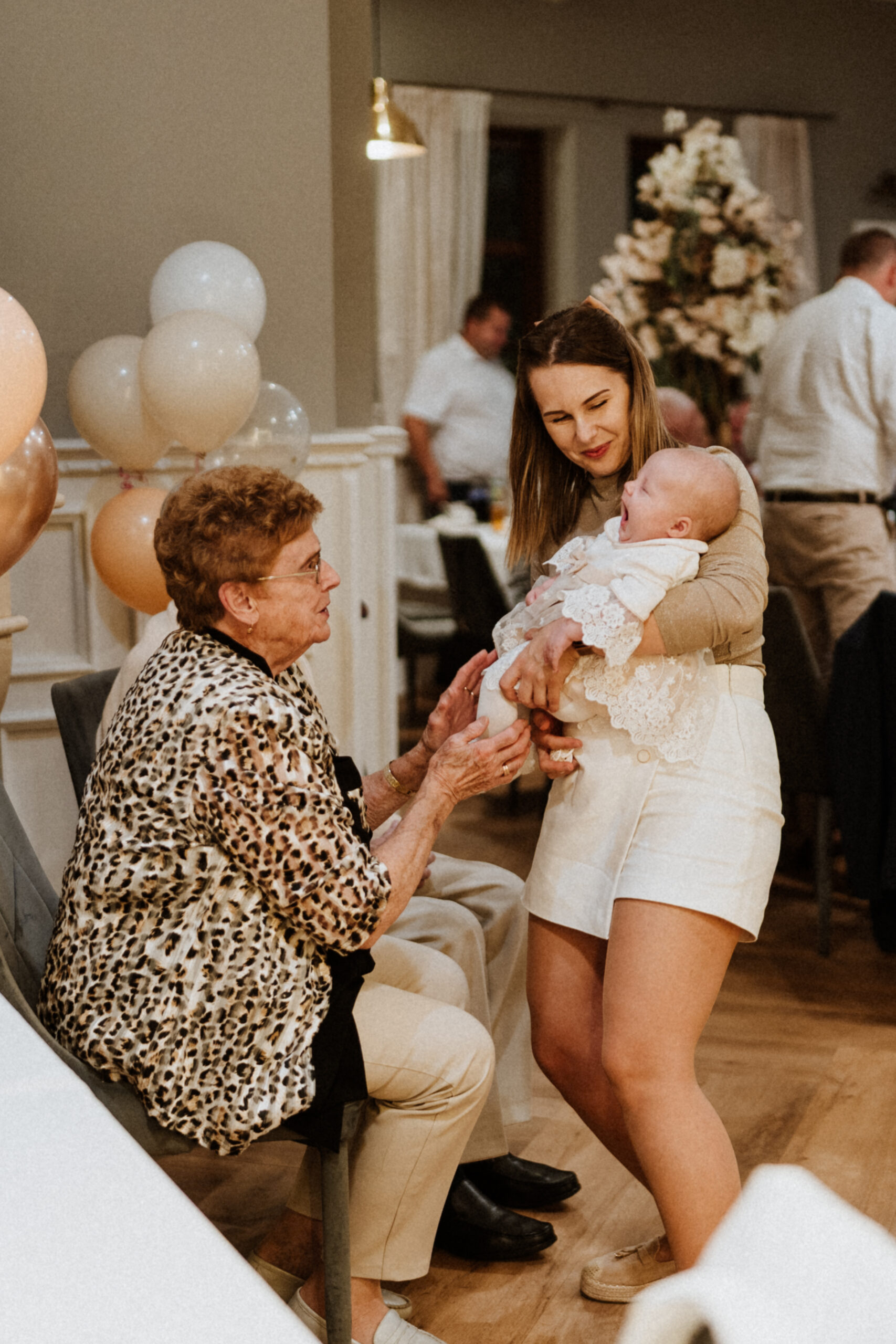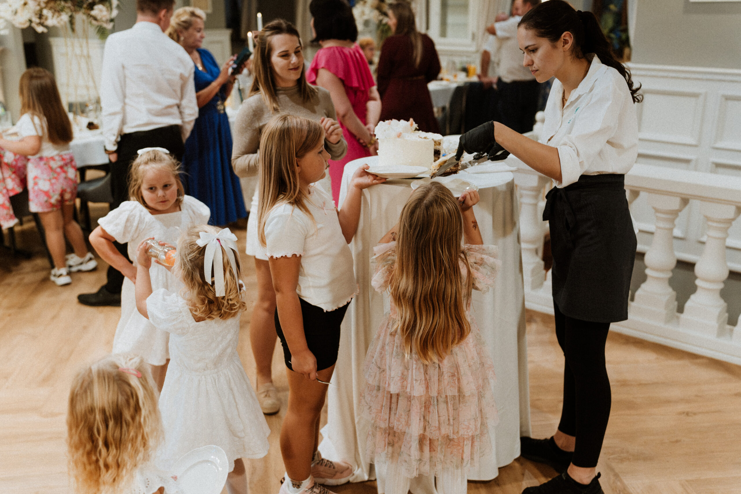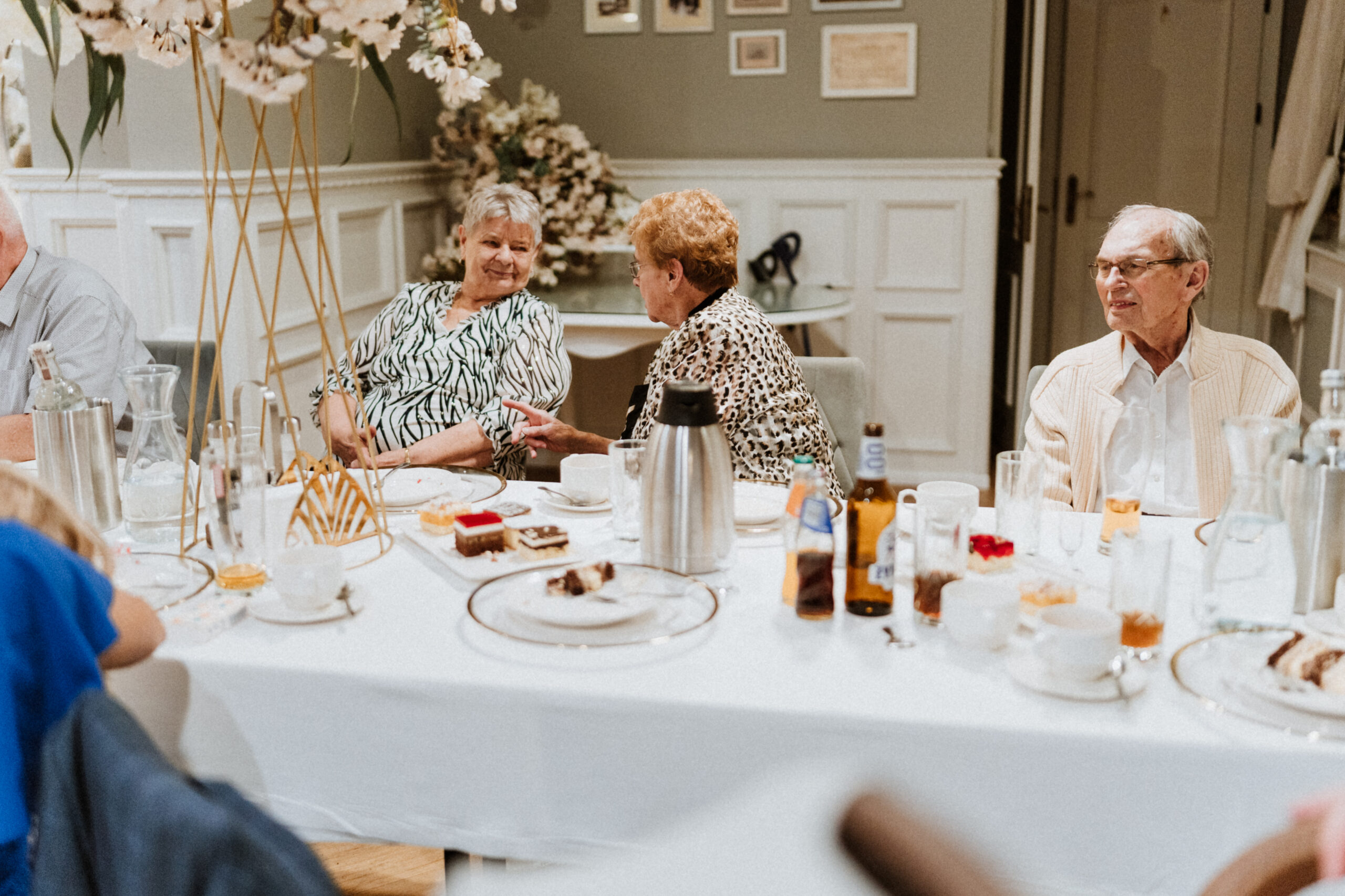 Po uroczystości – już mniej oficjalnie. Śmiech przy stole, dzieci biegające wokół, ciasta, które znikają szybciej niż można zrobić zdjęcie, babcia tuląca wnuczka i dziadek, który po raz kolejny powtarza, że „to szczęście mieć taką rodzinę”.