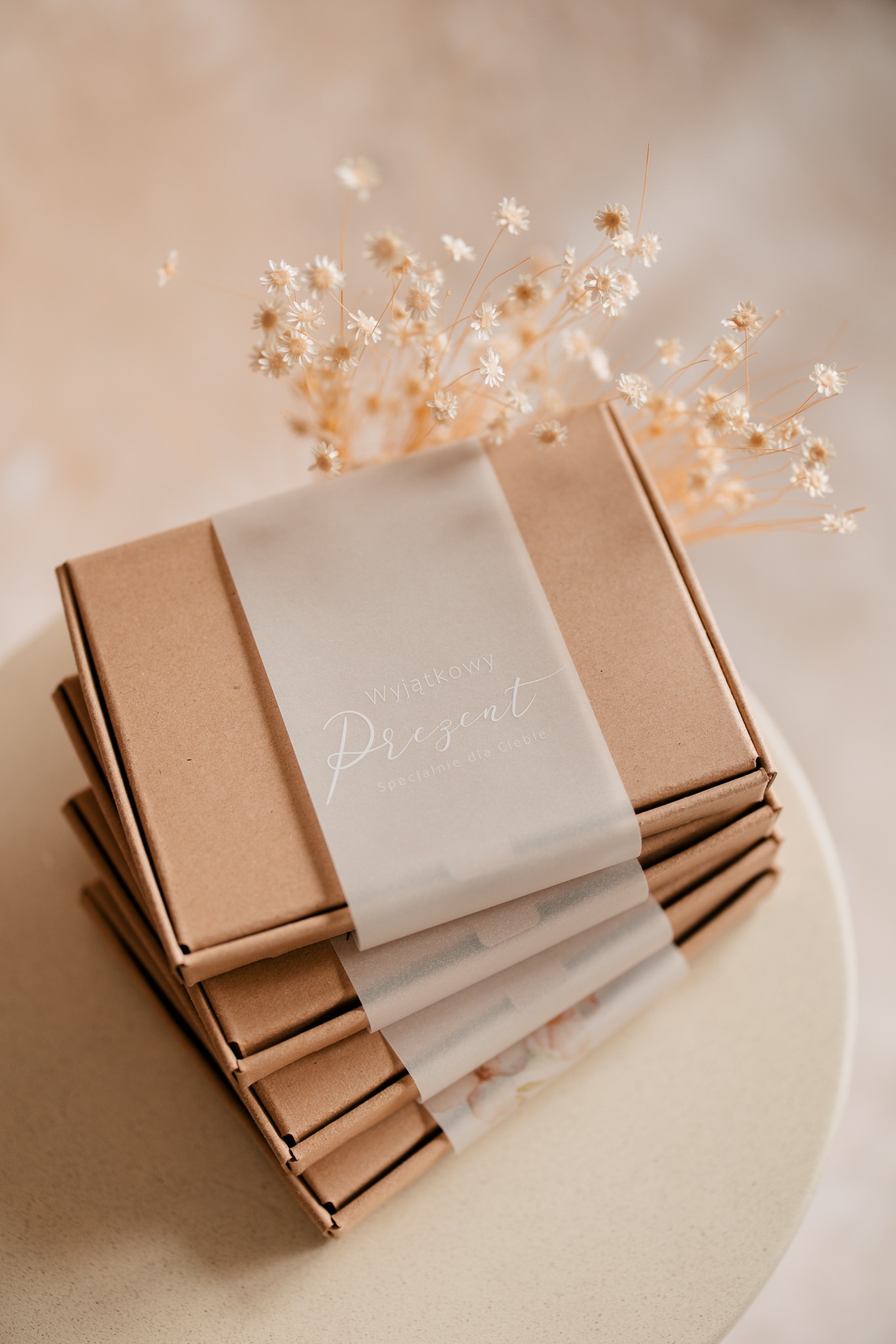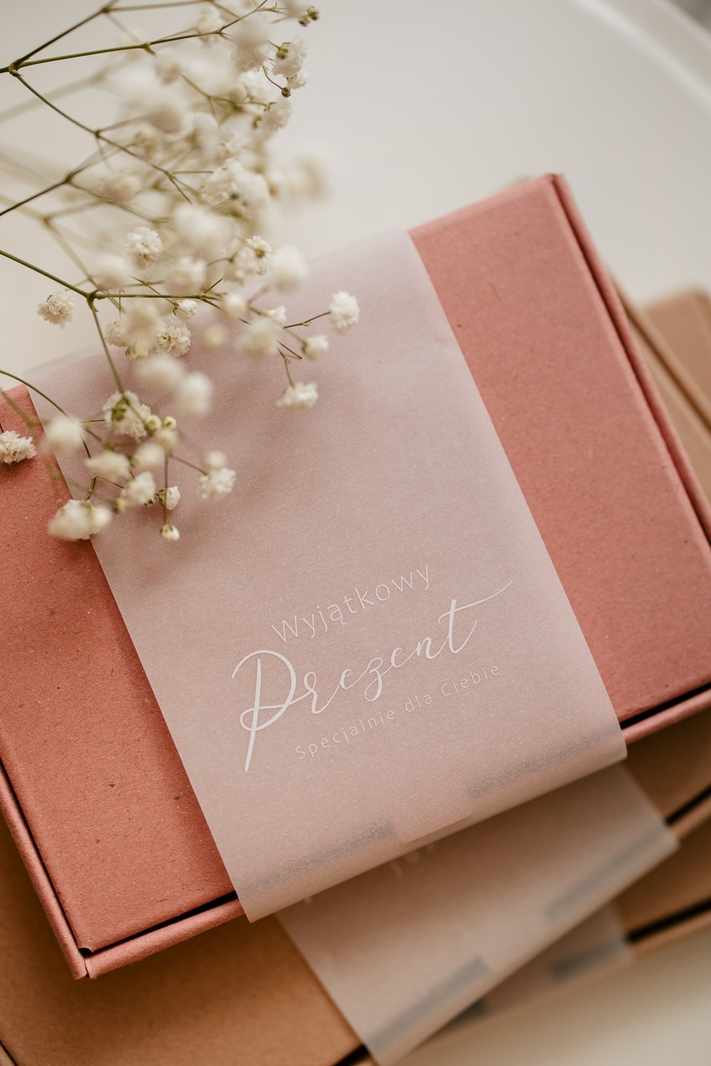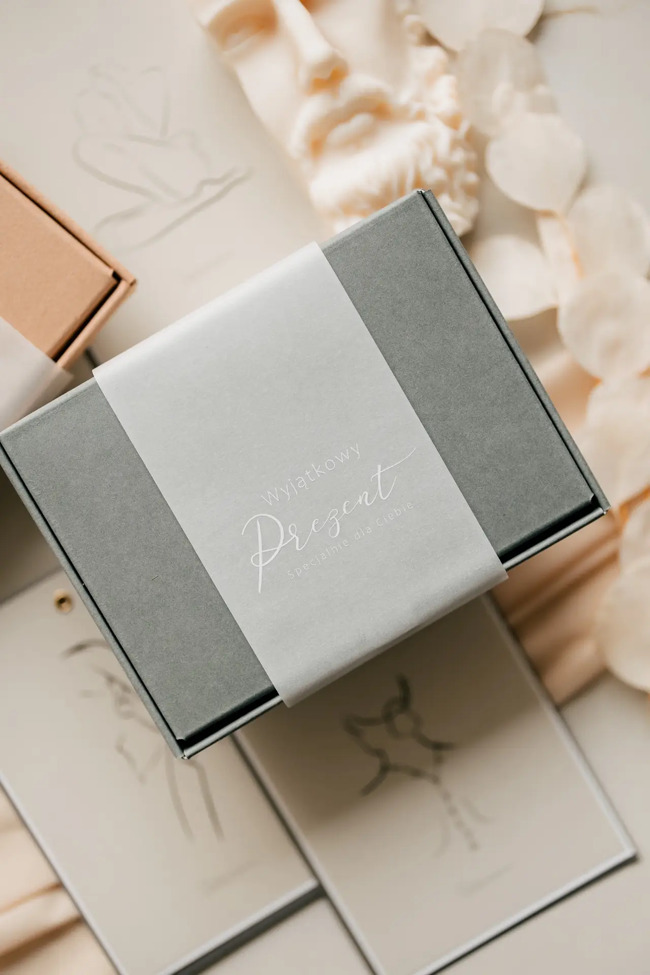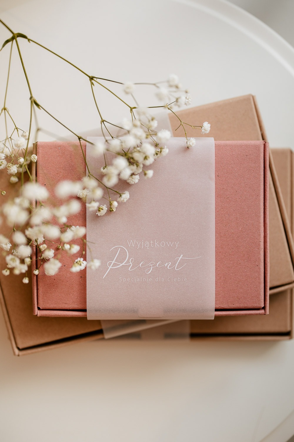 Pudełko na voucher tekturowe idealnie skrojone specjalnie dla powyższych voucherów. Sztywna, odporna tektura w odcieniu brudnego różu, brązu lub w kolorze szarym. W środku ozdobna bibułka. Na transparentnym pasku napis Wyjątkowy prezent specjalnie dla Ciebie lub Wyjątkowy prezent by zachować Wasze momenty.