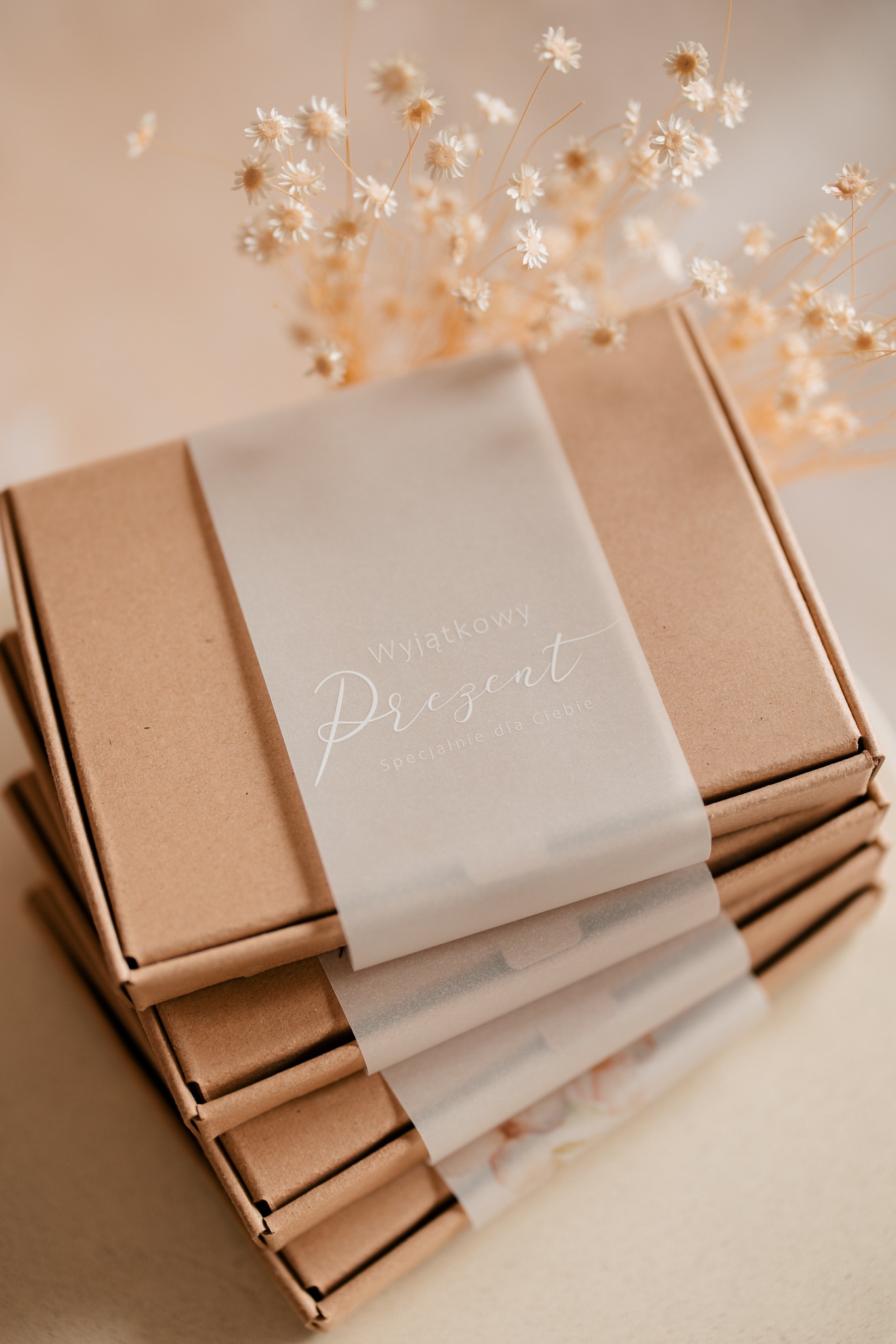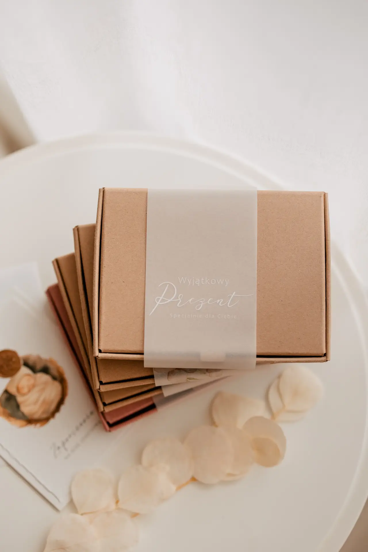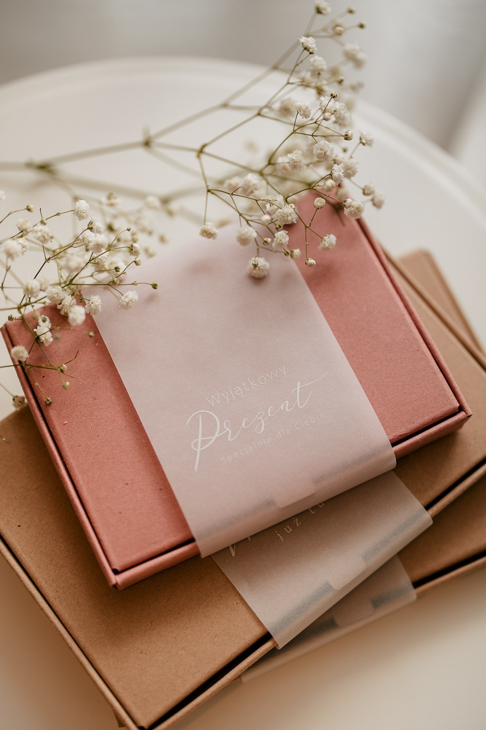 Pudełko na voucher tekturowe idealnie skrojone specjalnie dla powyższych voucherów. Sztywna, odporna tektura w odcieniu brudnego różu, brązu lub w kolorze szarym. W środku ozdobna bibułka. Na transparentnym pasku napis Wyjątkowy prezent specjalnie dla Ciebie lub Wyjątkowy prezent by zachować Wasze momenty.