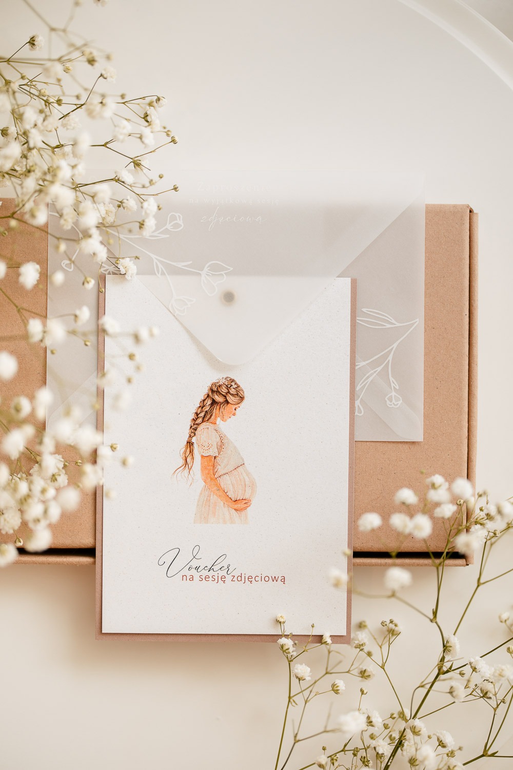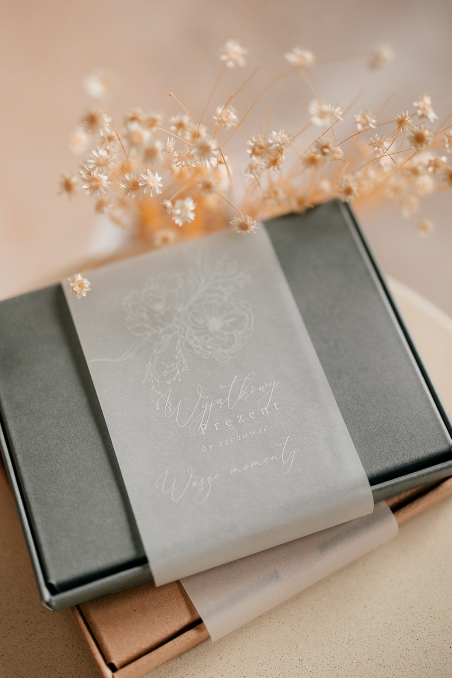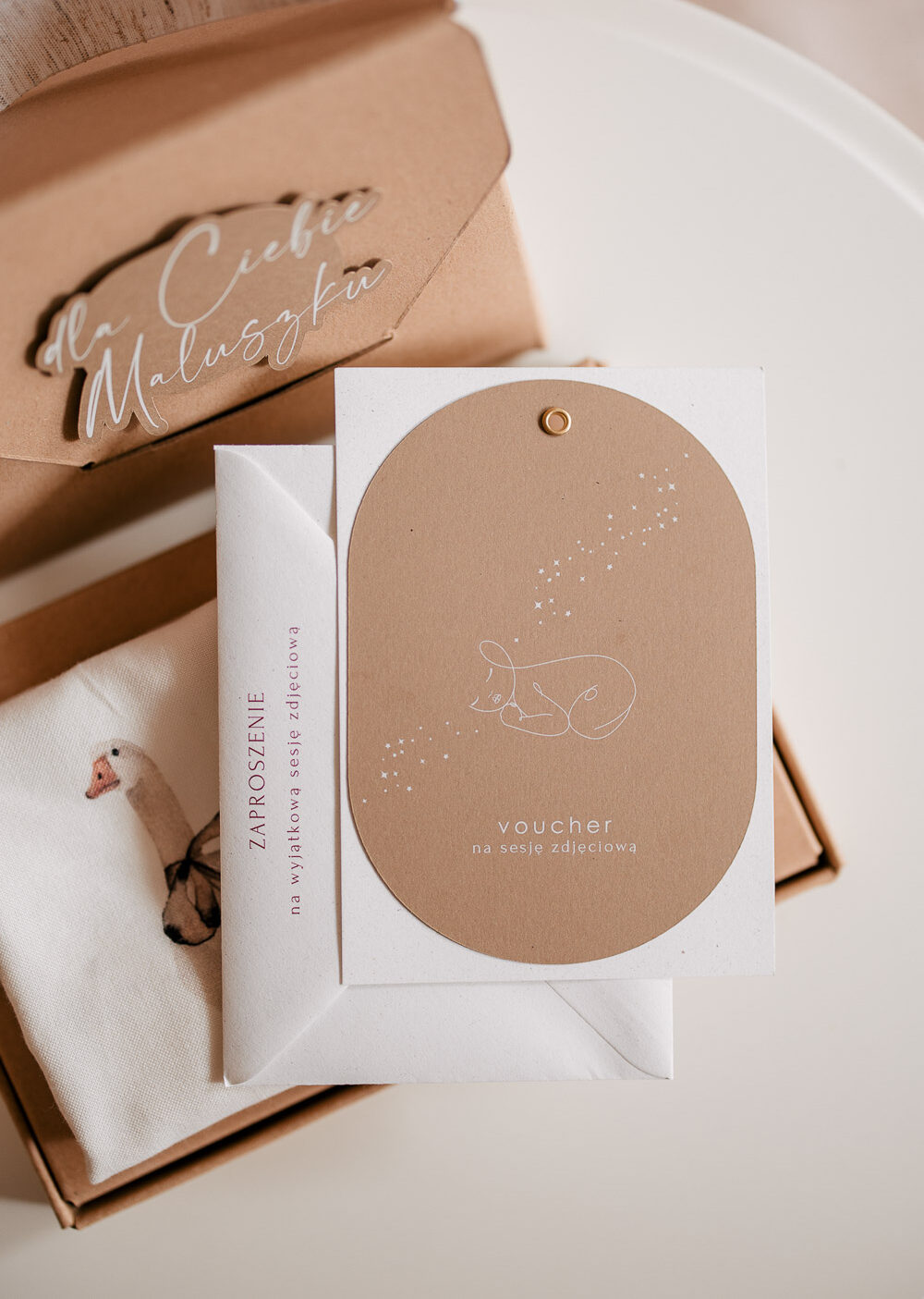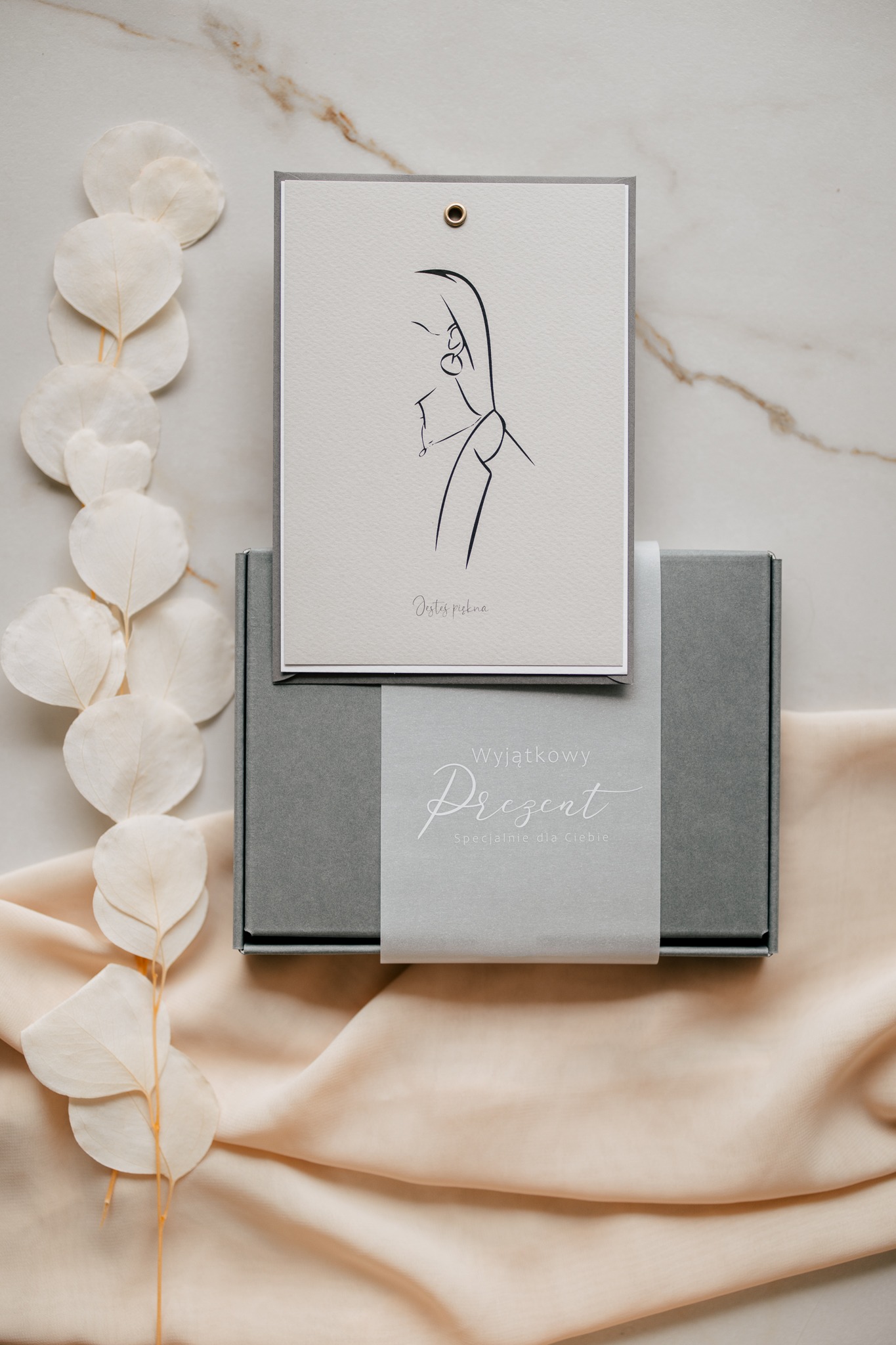Pudełko na voucher tekturowe idealnie skrojone specjalnie dla powyższych voucherów. Sztywna, odporna tektura w odcieniu brudnego różu, brązu lub w kolorze szarym. W środku ozdobna bibułka. Na transparentnym pasku napis Wyjątkowy prezent specjalnie dla Ciebie lub Wyjątkowy prezent by zachować Wasze momenty.